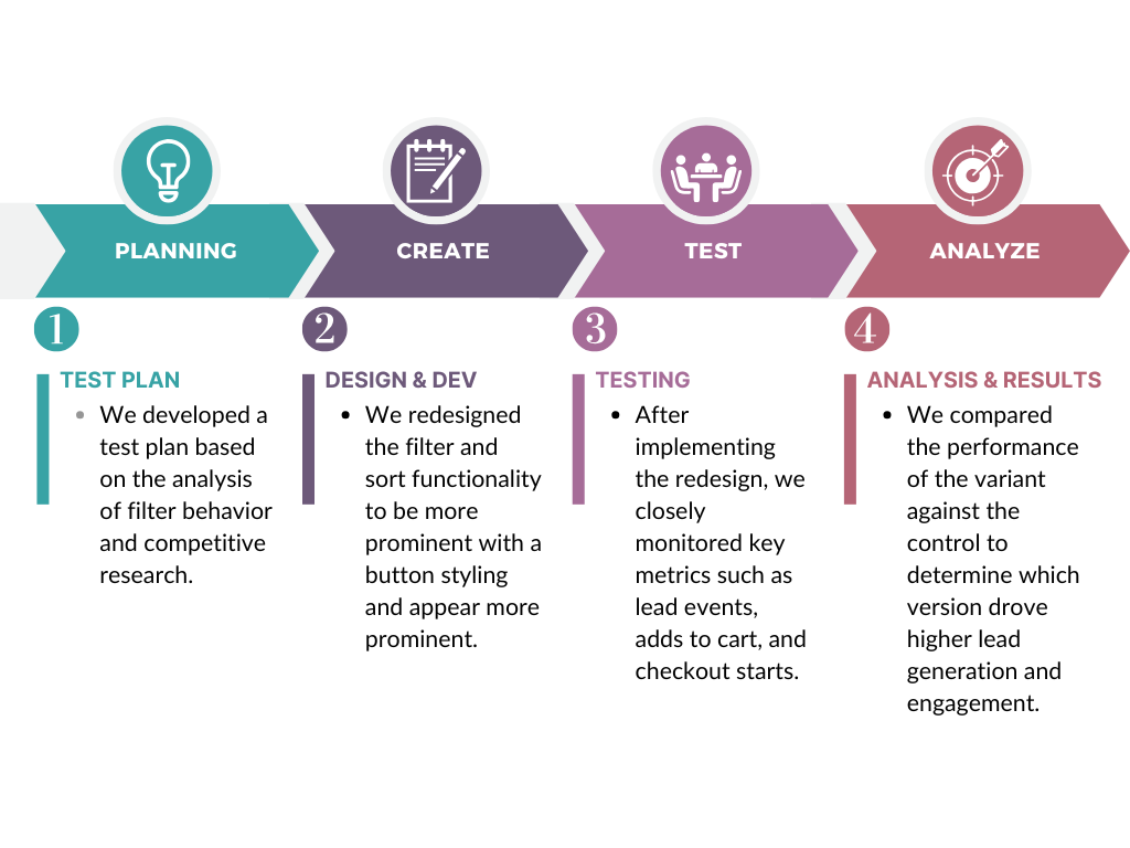 This test aimed to optimize user engagement on the product listings page by making the filter and sort functionality more obvious to users. Research showed that users were not actively engaging with the filter and sort options, which made it harder for them to find the products they were looking for. By improving the design of these elements, we hoped to enhance the browsing experience, leading to higher conversion rates and increased lead generation. The variant redesign turned the filter and sort dropdowns into visible buttons to improve their prominence and encourage more active use.